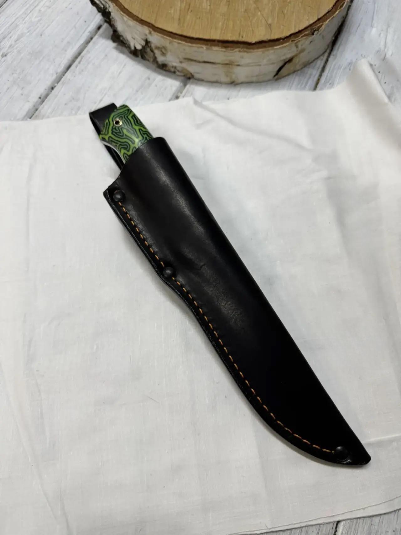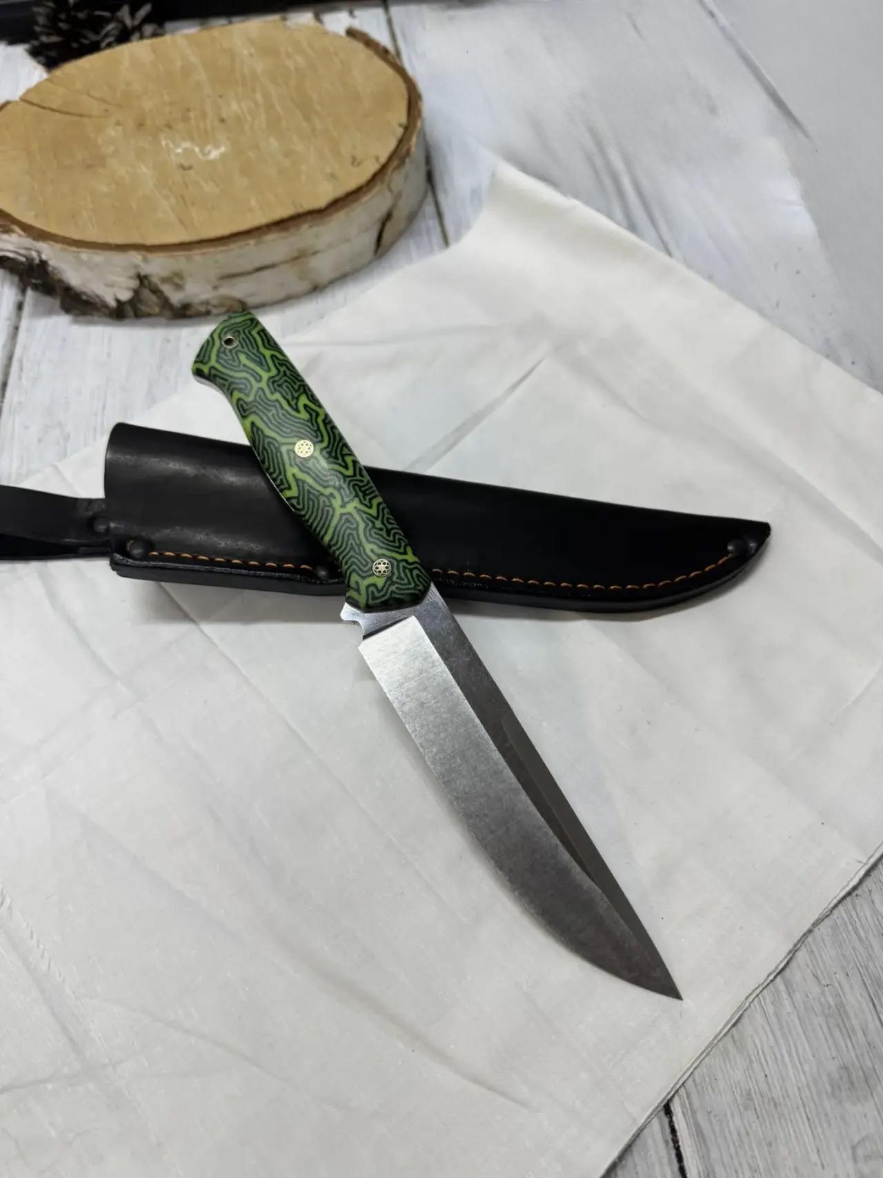 Качественная и прочная сталь AUS10co, закалка 61-62hrc. Длина лезвия 150 мм, ширина 32, толщина в обухе 3,5 мм. Рукоять из микарты ручной работы. Имеется отверстие под темляк. Мозаичные пины.